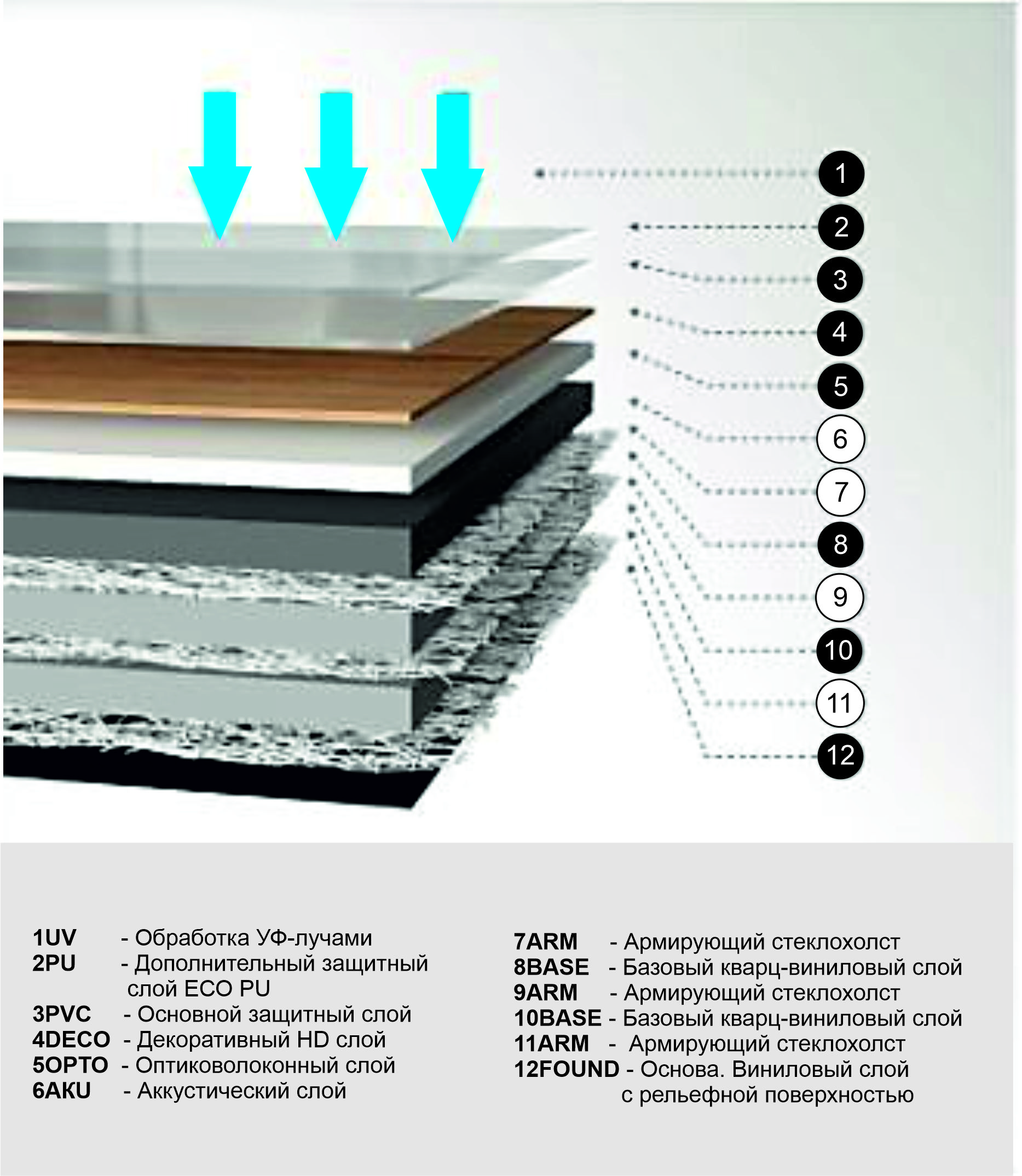 Основную нагрузку при эксплуатации берет на себя верхний рабочий слой плитки, состоящий из кварцевого песка, придающего ему прочность и винила, делающего покрытие эластичным. Дополнительной защитой от износа служит чистый полиуретан, нанесенный на карц-виниловую основу.
